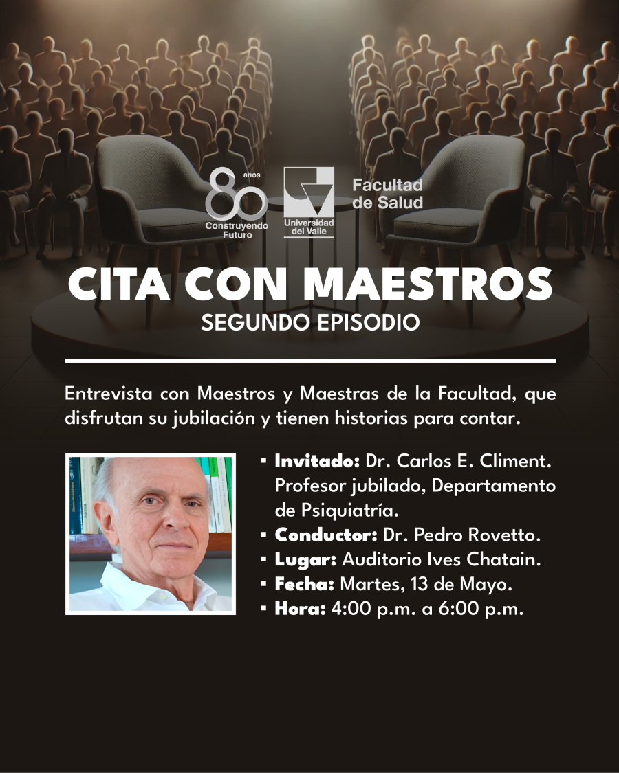 Cita con Maestros es un espacio para el diálogo con profesores y profesoras jubilados de la Facultad de Salud, quienes han dejado una imborrable y edificante huella en sus estudiantes y en la misma Institución. La entrevista es conducida por el Doctor Pedro Rovetto, médico y patólogo, también profesor jubilado de la Universidad, entrevistará al Dr. Carlos Climent, profesor jubilado del Departamento de Psiquiatría.