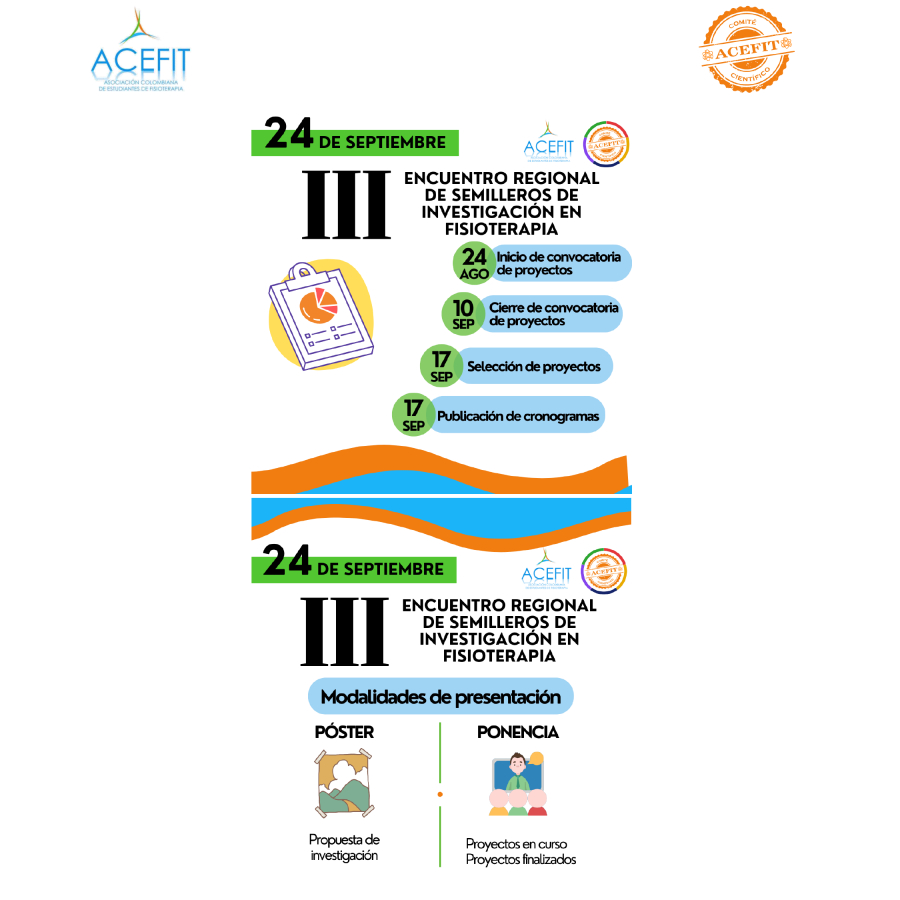 El Comité Científico de la Asociación Colombiana de Estudiantes de Fisioterapia (ACEFIT) invita al III ENCUENTRO REGIONAL DE SEMILLEROS DE INVESTIGACIÓN EN FISIOTERAPIA con el objetivo principal promover la investigación formativa por parte de los estudiantes de pregrado de fisioterapia pertenecientes a ACEFIT en cada una de las regionales, disponiendo espacios para la educación continua e investigación a través de una jornada académica el día 24 de septiembre de 2022.
