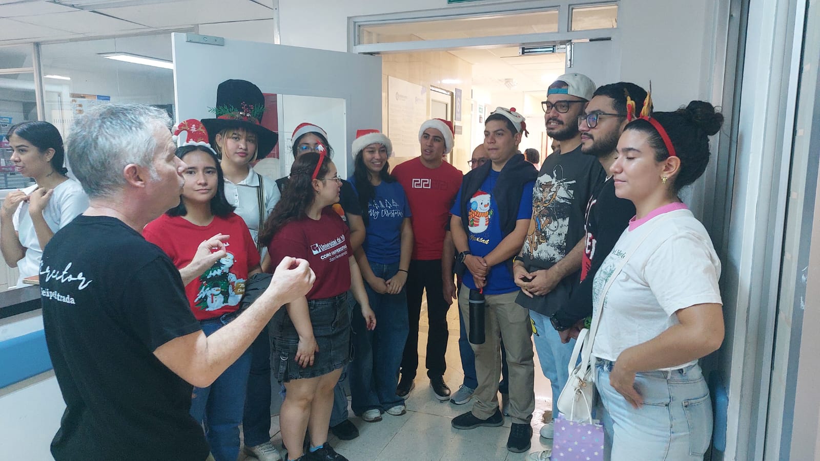 Atendiendo esta recomendación, la comunidad de la Facultad de Salud realizó la entrega de donaciones el pasado 18 de diciembre, que incluyeron insumos de aseo personal, toallas, cobijas, pijamas para niños y adolescentes, sandalias, tapabocas, así como materiales de entretenimiento seguros, entre ellos cartillas para pintar, colores, marcadores, cerámicas, pinturas y pinceles. También se entregaron sacos, gorritos, medias abrigadas, audífonos y otros elementos de uso cotidiano, fundamentales para el confort de los pacientes. Durante la jornada, la visita se vio acompañada por la participación del Coro Universitario del Campus San Fernando, que llevó música y mensajes de esperanza a los pacientes y a sus familias, generando un ambiente de alegría y acompañamiento en la unidad.