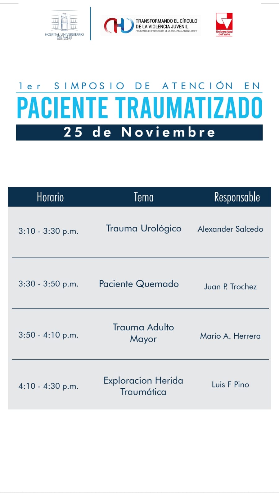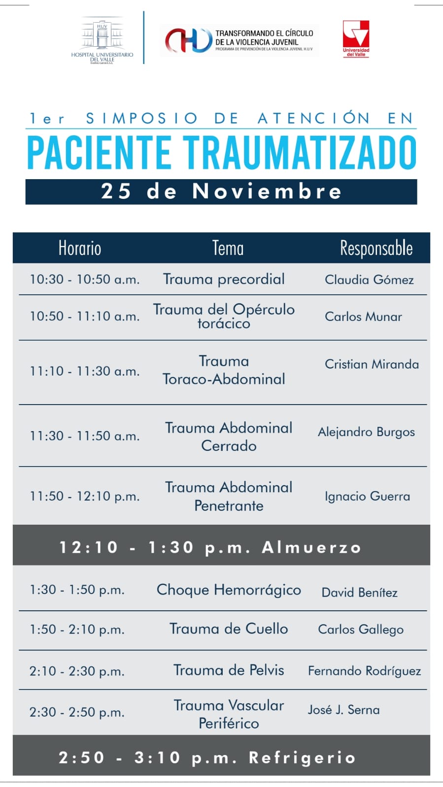 La Universidad del Valle en alianza con el Hospital Universitario del Valle “Evaristo García” E.S.E a través de su Programa Transformando el Círculo de la Violencia, realizarán el Primer Simposio de Atención en Pacientes Traumatizados y el lanzamiento oficial del libro digital “Paciente Traumatizado- Manual de Manejo Inicial” el 25 de noviembre, desde las 7:00 a.m. hasta las 4:30 p.m. en el Auditorio Carlos Manzano, segundo piso del HUV.