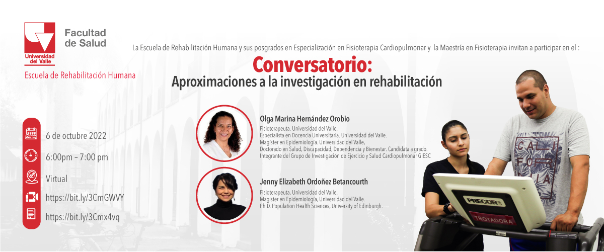 La Escuela de Rehabilitación Humana les invita a participar del conversatorio Aproximaciones a la investigación en rehabilitación, a cargo de las fisioterapeutas: Olga Marina Hernández Orobio y Jenny Elizabeth Ordoñez Betancourth.