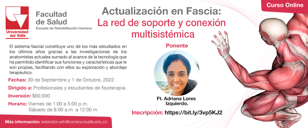 Les invitamos a participar del curso virtual Actualización en Fascia: La red de soporte y conexión multisistémica, dirigido por la fisioterapeuta Adriana Lores Izquierdo, a llevarse a cabo este 30 de septiembre y 1 de octubre de 2022. Más información: https://drive.google.com/file