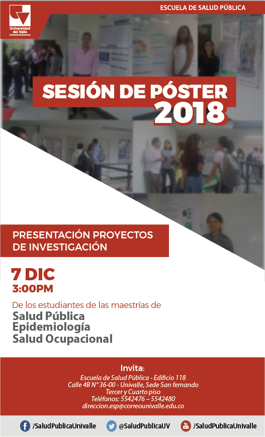 El viernes, 7 de diciembre a partir de las 3:00 p.m se realizará la Sesión de Póster de la Escuela de Salud Pública 2018, en donde se presentarán los Proyectos de Investigación de los estudiantes de las maestrías. Estas exposiciones se harán en el tercer y cuarto piso de la Escuela.