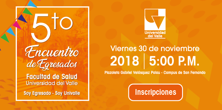 El próximo viernes 30 de noviembre se llevará a cabo el V Encuentro de Egresados de la Facultad de Salud se realizará; el evento tendrá lugar de 5.00 p.m. a 8.30 p.m., en la Plazoleta Gabriel Velásquez Palau del Campus San Fernando de la Universidad del Valle.