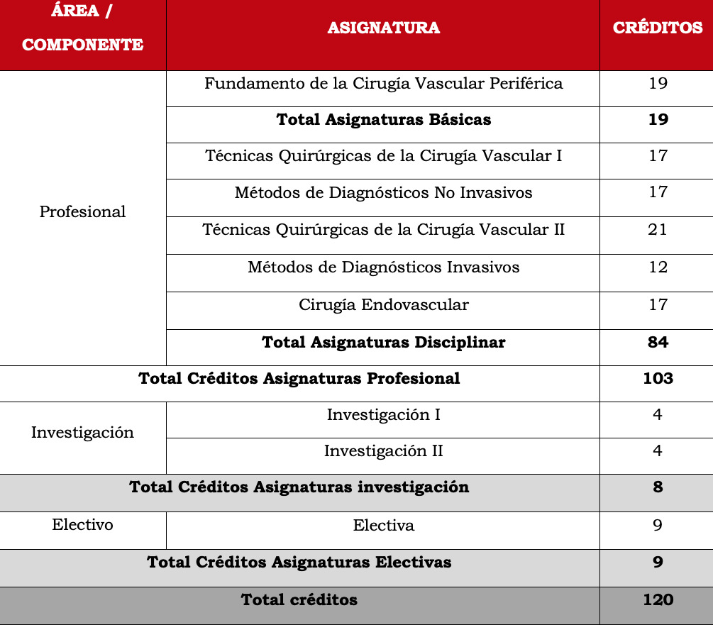 Formar especialistas en Cirugía Vascular Periférica con conocimientos científicos actualizados que le permitan realizar intervenciones diagnósticas invasivas y no invasivas, como también definir las intervenciones terapéuticas médicas o quirúrgicas requeridas para disminuir la progresión de la enfermedad y la mortalidad prematura por enfermedad vascular periférica, de igual manera, contribuir a la solución de problemas de salud a través de la investigación disciplinar e interdisciplinar.